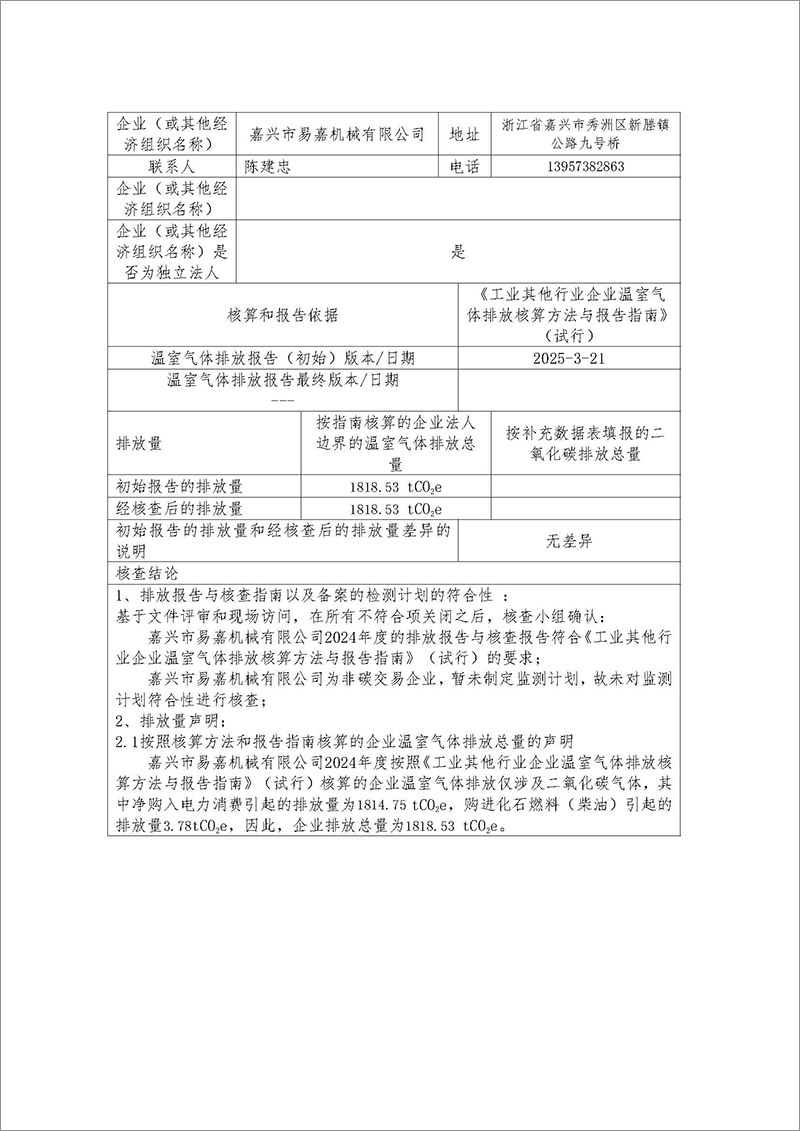 嘉兴市易嘉机械有限公司产品碳足迹核查报告(2024年度)